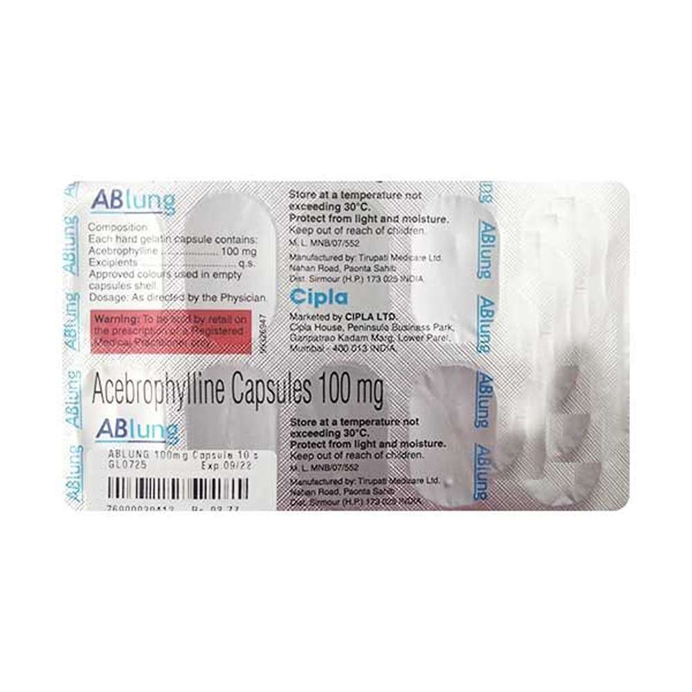 Ablung 100mg Capsule is used to treat and prevent symptoms of asthma, bronchitis, and chronic obstructive pulmonary disorder (a lung disorder in which airflow to the lung is blocked). It helps relax the muscles of the air passages, thus widening them and making them easier to breathe.