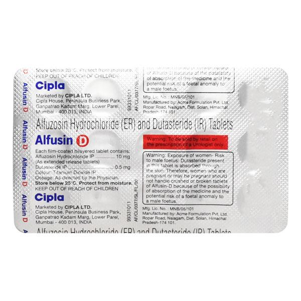 alfusin D Tablet ER is a combination of two medicines that work in different ways to treat men with an enlarged prostate gland. It helps to relieve symptoms such as difficulty urinating or needing to go to the toilet more often. It is not used to prevent prostate cancer.