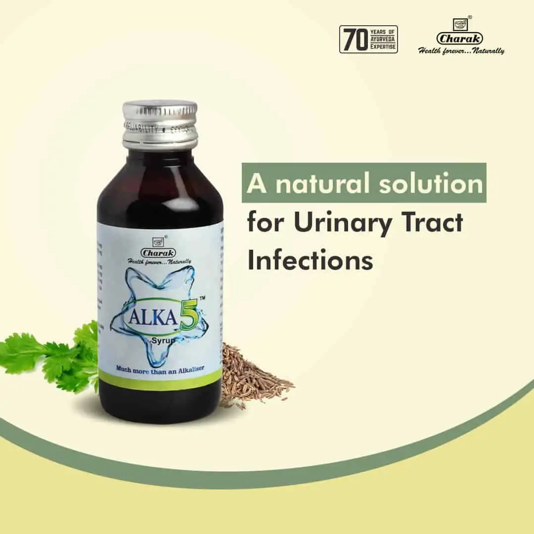 ALKA5 syrup is a natural alkaliser that helps to maintain a normal urine pH balance. Yavakshara is a potent urinary alkaliser with mild diuretic activity. Thus, it reduces burning micturition. Dhanyak (Coriandrum sativum) is soothing, with diuretic and antibacterial properties while Jeerak (Cuminum cyminum) acts as antispasmodic and antimicrobial. Gokshura (Tribulus terrestris) with its diuretic and lithotriptic property facilitates the passage of urinary calculi. ALKA5 being a urinary alkaliser helps reduce burning urination, ease urine flow and prevent recurrent urinary tract infections.