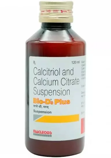 Bio-D3 Plus Suspension is a vitamin supplement that supports healthy bones and teeth. The tablet may support the functioning of nerves, cells, muscles, and the heart. The formula provides nutrients including calcitriol and calcium to support bone health.