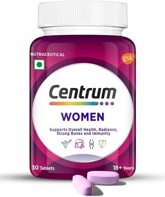 maintaining strong bones. Centrum Women is formulated with a plant-based botanical (sodium hyaluronate) that supports healthy supple skin and radiance from within. It contains vitamin A for eye health and Biotin to support healthy hair. Centrum Tablets are vegetarian and non-habit-forming. These are by nature gluten-free tablets and are Non GMO. Centrum Multivitamin supplements are manufactured in an FSSAI-certified facility that is GMP-certified.