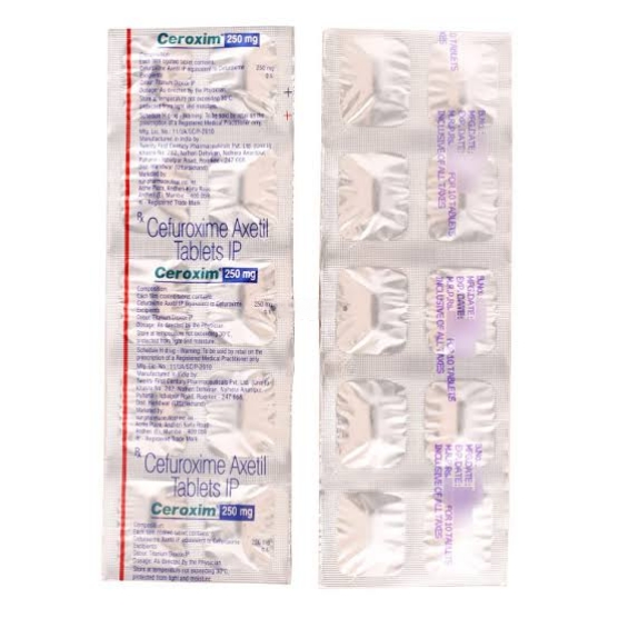 Ceroxim 250mg Tablet is an antibiotic medicine used to treat bacterial infections in your body. It is effective in infections of the lungs (e.g., pneumonia), ear, throat, nasal sinus, urinary tract, skin, soft tissues, bones, and joints. It is also used to prevent infections during surgery.