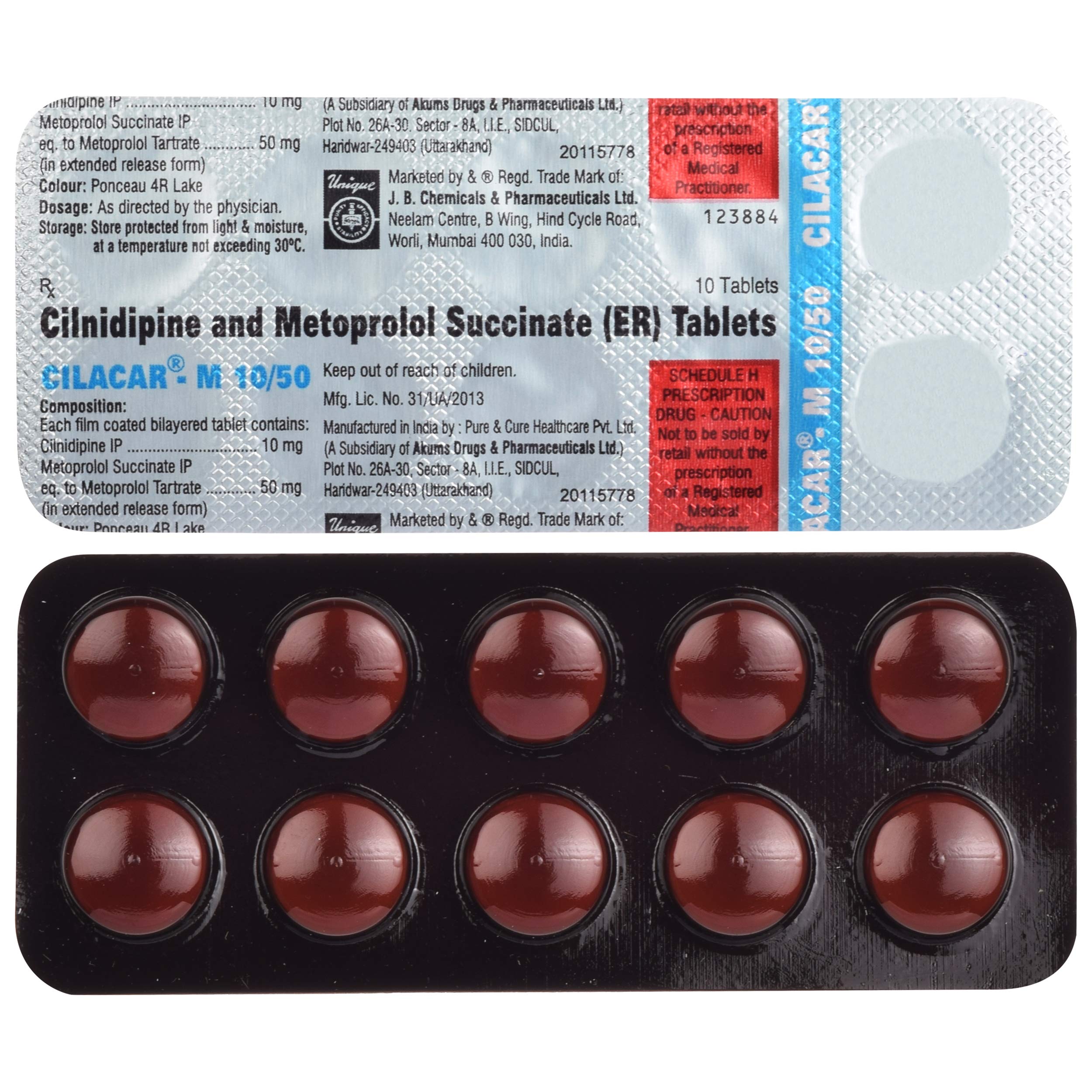 Cilacar-M 10/50 Tablet ER is a medicine used to treat hypertension (high blood pressure). It is a combination of two medicines that effectively controls blood pressure when a single medication is not effective. By lowering the blood pressure, it helps in preventing future heart attacks and strokes.