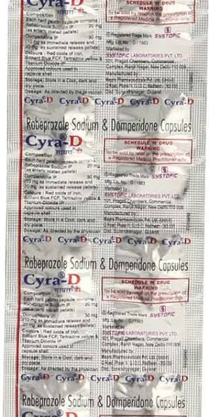 Cyra-D Capsule is a combination medicine used to treat gastroesophageal reflux disease (acid reflux). It works by relieving the symptoms of acidity, such as heartburn, stomach pain, or irritation. It also neutralizes the acid and promotes easy passage of gas to reduce stomach discomfort.