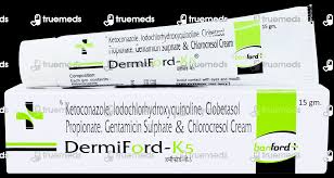 Dermiford-K5 Cream is a combination medicine used to treat different kinds of skin infections. It works by stopping the growth of infection-causing bacteria on your skin. This minimizes symptoms of inflammation such as redness, swelling, and itching.