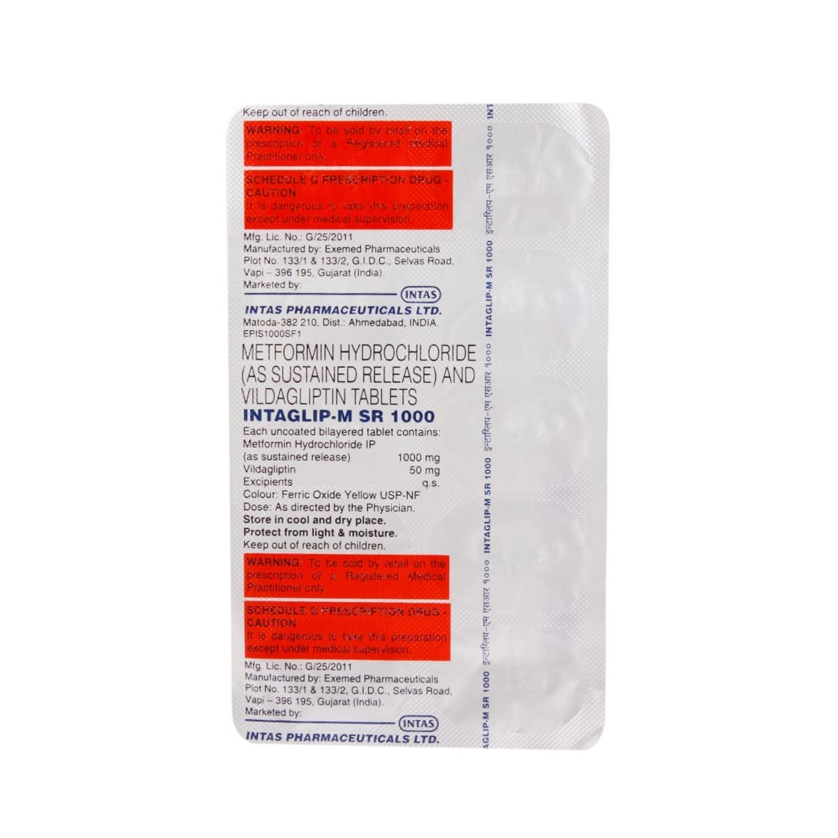 Intaglip-M SR 1000 Tablet is a combination of two medicines that control high blood sugar levels in people with type 2 diabetes mellitus. This helps prevent serious complications of diabetes, such as kidney damage and blindness, and may also reduce your chances of having a heart attack or stroke.