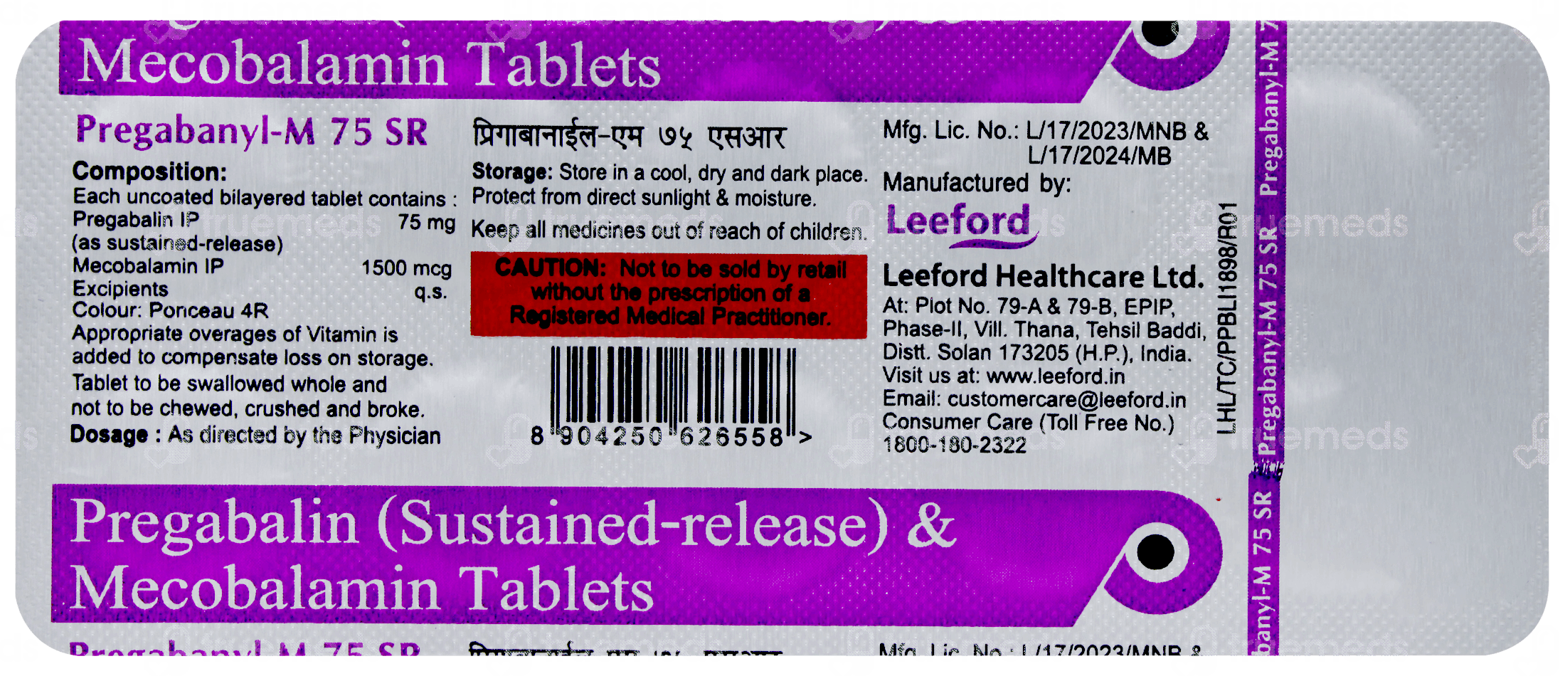 DESCRIPTION: Pregabalin-M 150 SR Capsule is a combination of Pregabalin in sustained release form & Mecobalamin which is used for neuropathic pain associated with diabetic peripheral neuropathy or spinal cord injury, postherpetic neuralgia, fibromyalgia, and adjunctive therapy for partial onset seizures. Pregabalin in Sustained release form provides day long action.