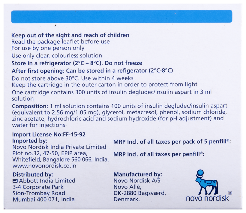 Ryzodeg 100IU/ml Penfill is a combination of two medicines, a long-acting and a rapid-acting type of insulin, used to treat types 1 and 2 diabetes mellitus in both adults and children. It provides a steady level of insulin in the body for an entire day and helps control blood sugar levels.