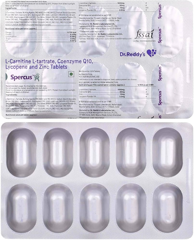 Spercus 1000mg/50mg/2.5mg/10mg Tablet is a formulation that contains Coenzyme Q 10, L-carnitine L-tartrate, Lycopene and Zinc. It supports nerve and cardiac health and may increase blood production. It boosts energy levels and prevents fatigue and exhaustion. The formula is rich in antioxidants and helps to reduce oxidative stress. It may help to regulate blood sugar levels and improve lipid metabolism. It helps to increase physical performance and endurance.