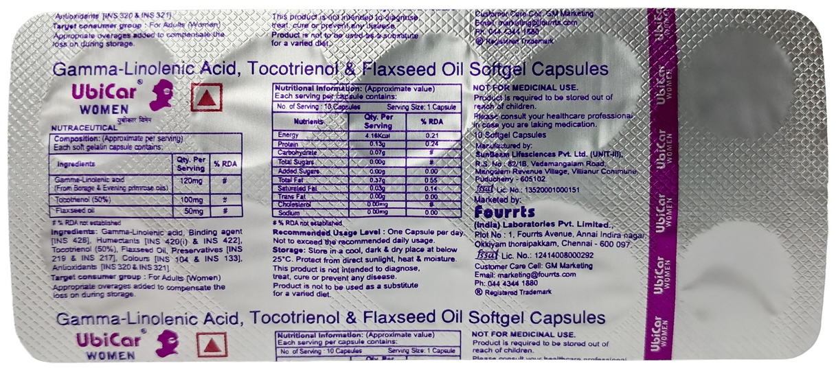 Ubicar Women Capsule: is a specialized combination medicine crafted to address mastalgia and fibrocystic breast disease, both prevalent issues affecting 70% of women, particularly those aged 30-50. This capsule stands out for its targeted relief, effectively managing breast pain and discomfort associated with mastalgia while also addressing symptoms related to fibrocystic breast disease. Key Ingredients: Gamma-linolenic acid 120mg (from borage and evening primrose oils), Tocotrienols 100 mg, Flax seed oil 50 mg, Other ingredients: Gelatin (INS 428) Glycern (INS 472) Sorbitol (INS 420) Preservative (Sodium Methyl Paraben (INS 219) and Sodium Propyl Paraben (INS 217) and Colours (INS 104 and INS 133)